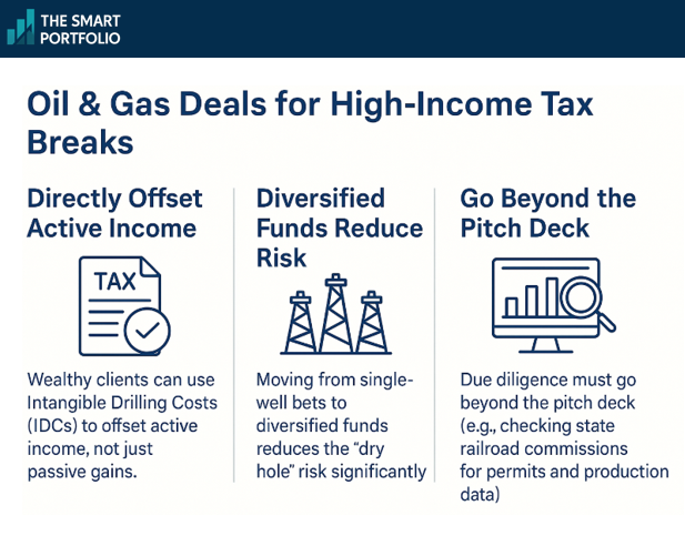 Wealthy clients can use Intangible Drilling Costs (IDCs) to offset active income, not just passive gains.