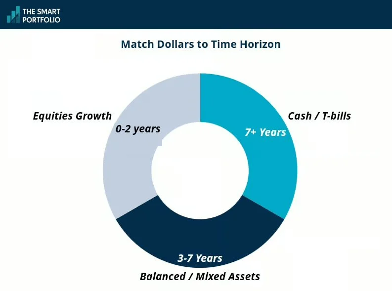 Pre-tag dollars by time horizon: 0-2 years cash-like, 3-7 years balanced, 7+ years equity heavy.