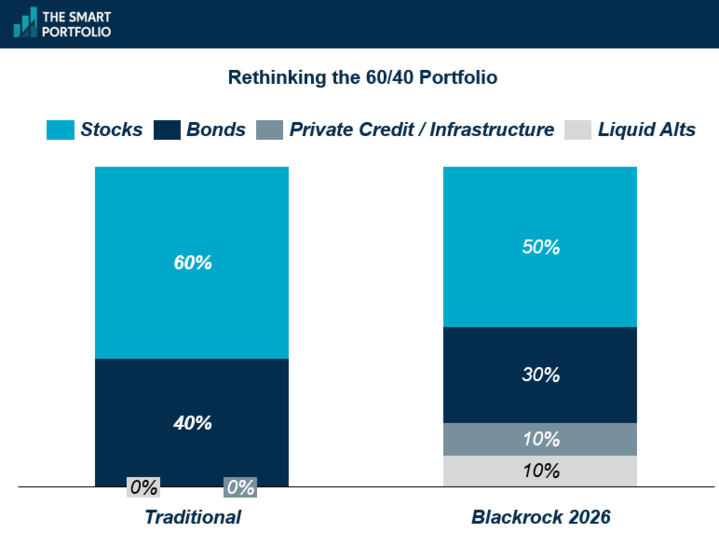 BlackRock's recommended structure is closer to 50/30/10/10 into stocks, bonds, private credit or infrastructure (for those who can access it), and liquid alternatives or diversifiers like gold. The goal is diversifying your diversifiers, not relying solely on bonds to provide portfolio balance.