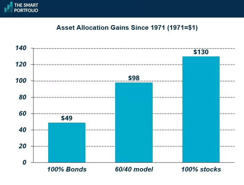 Inflation erodes spending power. To keep up and get ahead, long-term money belongs in diversified stocks and bonds, not cash. Simple math from the show: since 1970, $1 in 100% bonds grew to ~$49, a 60/40 mix to ~$98, and 100% stocks to ~$130.