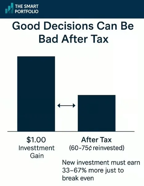 If you sell a successful investment in a taxable account, you may be reinvesting only 60-75c on the dollar after taxes. That means the next idea must be far better just to catch up.